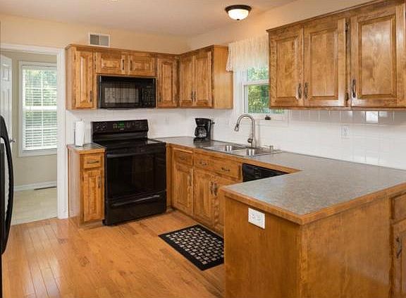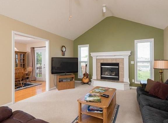 This single owner house features main level living with all three bedrooms and two bathrooms on one floor & laundry room too! Master has walk-in closet and en suite bathroom. A spacious living room with vaulted ceiling has a gas fireplace for ease of living, and the eat-in kitchen has hardwood floors and a double door walkout to the deck overlooking the large fenced back yard, great for kids and pets. Built-ins in garage for lots of tools! A trail behind the home runs directly to the pool - greenspace behind home!