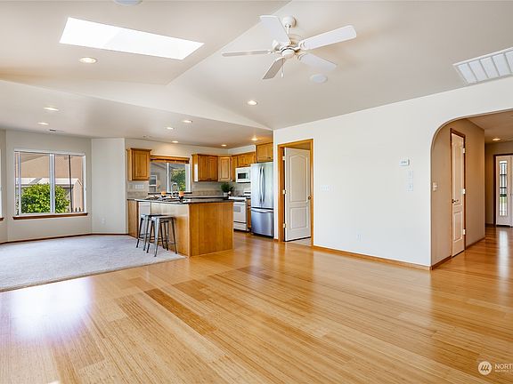 Fabulous Birch Bay Village EZ living single story golf course home w/entertainment sized deck overlooking beautiful 6th Fairway. In addition to generous double garage there's a 3rd bay Huge 32'attached RV/boat garage w/12' doors & shop. Inside enjoy a bright & spacious great room w/living/primary suite dbl. sided gas fireplace. Easy care landscaping & short distance to marina & miles of inland Pacific beaches. Birch Bay Village has 24/7 guard gated security, clubhouse, pickleball, tennis, dog park, private Golf course 250 slip marina w/completely new floats by 2024. Community beachfront parks & list goes on. just 25 mins to Bellingham & 15 mins. to U.S./Canada border. Located in Rain Shadow w/ 8" less rain annually than nearby Bellingham.