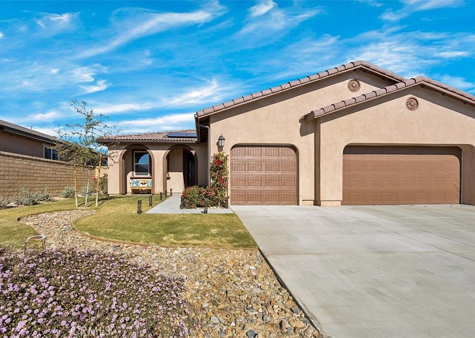 This incredible 2022 new build in a beautiful gated community along the mountain range is a must see. The style and beauty of this particular home is not seen anywhere in the community. It is a 3 bedroom and 2 full bath with an incredible interior. The amount of extras in the home are too many to detail. It is a smart home that you are able to control lighting, garage door, and appliances, as well as offers fire sprinklers throughout. With new landscape as you walk up to the home is a relaxing oasis and in the evening custom walk up lighting. The solar panels are owned outright on top of a clay roof. The entry with office/workout area of to side, the new flooring is amazing and scratch and water resistance in the kitchen and living areas. The kitchen wide open has new granite counters, under cabinet lighting, Reverse Osmosis water system, walk-in pantry, coffee area, new appliances, and a huge island for cooking and entertaining, the living room also wide open to the back and has the most relaxing atmosphere, and gas fireplace. Both have custom fans and lighting that is just enamoring. As you make your way to the bedrooms they are large and roomy, with tons of closet space, a common bathroom newly tiled, that is bright and long counter and full bath with shower and bathtub. The laundry just off the inside. Then you make your way to the master bedroom that is so spacious and bright with natural light much like the rest of the home. With a TV/Sitting area off the bedroom it allows so much privacy. The bathroom is wide open and beautiful. Large open backyard with play area, nice veered patio with lighting and fan. The home HOA includes internet and cable TV, parks and walking areas, and a playground. Awesome views of the mountain range. This home is near so many amenities, a growing community and a short distance to Joshua Tree national park.