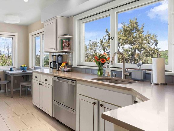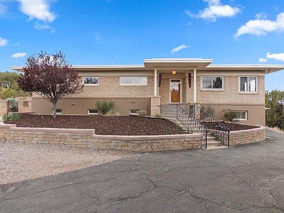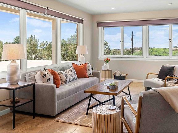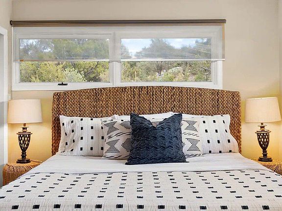 Stylish and fully renovated 1,600 sq ft, ground floor, 2br/2ba townhome in a two-story, mid-century modern home, just minutes from The Plaza, Opera House, hiking, biking, skiing and other cultural attractions in Santa Fe. Sited above Bishops Lodge on .7 acres, this property offers mountain vistas, sunset views, a downtown location, privacy, stained concrete floors, covered patio dining & grill. Master with ensuite bath. Walk-in laundry room, WiFi, workstations, AC & driveway parking. Sleeps 4.