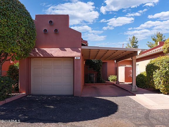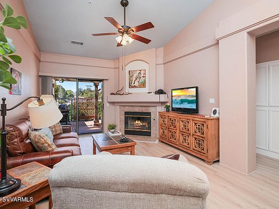 Beautifully updated condo in excellent location in West Sedona! Selling turn key furnished, this sweet property has everything you need to call home: covered parking plus one car garage, Great Room floorplan with gas fireplace, beautiful new Blonde LVP flooring, new bathroom vanity top & plumbing fixtures, new solid quartz kitchen counters w/new matte white subway tile backsplash, new deep kitchen sink & faucet, new fridge & dishwasher, & new light fixtures throughout home. Covered patio backs to wash for nature viewing plus peekaboo views of the Red Rocks! Property is half mile from coffee shops, grocery stores, banks, movie theater, wine bar, restaurants, & shopping. HOA covers roof, exterior maintenance of stucco & paint, trash, community pool & spa, landscaping, & exterior insurance.