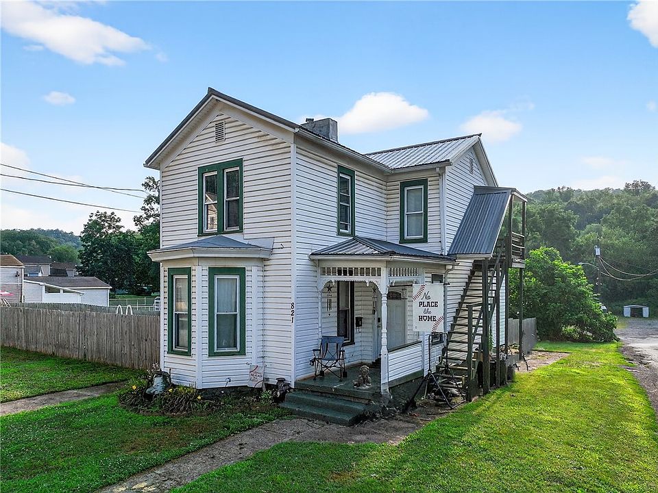 Modern Victorian Situated a Fully Fenced Double Lot! Newer Metal Roof, Furnace, Central Air & Radon System Already Installed for you! Charming details thru-out this home will not disappoint including bump out in the living room & original built ins! Enjoy a closet for winter coats & ceiling fan as well! Host family & friends in the oversized formal dining room w/built in hutch. The galley kitchen has newer cabinetry, countertops, & flooring. Convenient doggy door leads out to the amazing back deck & huge level yard! Enjoy this summer & fall on the deck! The 1st flr full bath is a rarity! Upstairs you will find original HW flooring.15X13 Owner's Suite w/3rd 13X8 Captive Bedroom, Currently being utilized as a Walk In Closet! This would make a perfect den or nursery as well! The 2nd bedroom is also 15X11! Updated Full Bath on this level as well. Plenty of off street parking or room for a garage. Conveniently located with backyard abutting ball fields + walkable to school & playground!