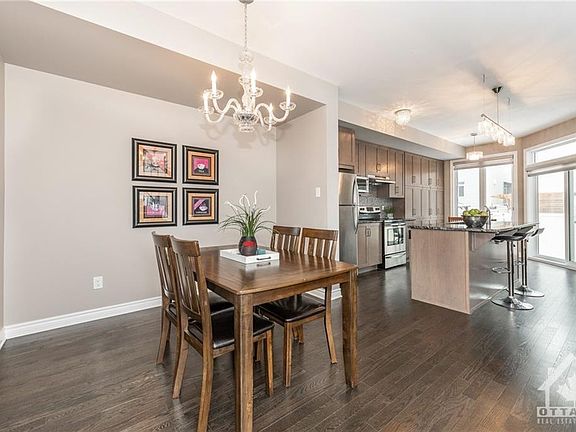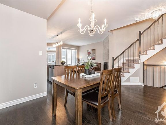 STUNNING TOWN HOME IN FINDLAY CREEK! Gorgeous upgraded home has tiled foyer entrance w/ double door coat closet & partial bath on main floor. Open concept main floor includes kitchen, dining room & living room; full of large windows, modern lighting, zebra self clean window blinds, beautiful gas fireplace feature wall & hardwood floors. Kitchen includes stainless steel appliances, granite countertops, extended soft close cabinetry w/upgrade pantry, eating area, plus island breakfast bar w/ sink & electrical plug. 2nd level features large primary bedroom with blackout blinds, 4 pc ensuite bath w/ separate soaker tub & walk in closet. 2 other bedrooms & full bath also on 2nd level. Fully finished lower level includes recreation room, storage room, washer & dryer, plus rough-in for future bath. Fully PVC fenced rear yard, backs onto single. Amazing location: Close to shopping, recreation, YOW, hwy, public transit & more!