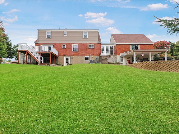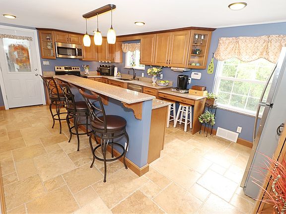Love Coming Home! Gorgeous 3 Bdrm, 2.5 Baths, 2 car garage, 1 acre. Stunning equip Maple kitchen w/Quarts countertops, long island w/plenty of storage, cabinets w/pull out drawers, 2pantries, peekaboo glass fronts, recessed lighting, & Travertine flooring. Oversized 15x12 dining rm, 24x13 living rm w/crown molding, Stone wd burning fireplace w/granite hearth & wormy chestnut above mantel & French drs to 13x12 Tex deck. Master & new addition walk-in closet. 2 more bedrooms one w/newly built office. full bath w/tub completes 2nd fl. Amazing finished lower level incl 19x11 family rm, 18x12 Bar area, & 24x13 game rm w/laundry area. Full bath (Shower) & utility area complete remodeled ('10) lower level Heated 12x8 enclosed breezeway. Covered hardscaped patio (15x10) w/rm that could be used as storage or additional entertaining area for chilly nights. 20x19'11 garage. 200 amp box '08, Additions '12, Furnace '14, New driveway '19, A/C '23. Thermo Twin windows