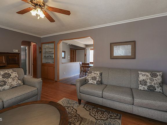 Upon entering into this timeless three-bedroom, two-bathroom home, you'll immediately sense the warmth and care that has filled its walls over the decades. The beautiful hardwood floors welcome you into the living space, setting a classic tone for the entire home. Passing through the arched hallway, you'll discover two bedrooms boasting great natural light and the same elegant hardwood flooring, alongside the updated full bathroom, adding modern comfort to the home's enduring charm. The heart of this home lies within its kitchen, where you'll find beautiful hickory cabinets with modern stainless handles, complemented by a stainless steel fridge and stove, and a microwave hood. The dining area offers a picturesque view of the deck and the backyard. Head to the lower level to find the third bedroom, adorned with hardwood flooring and featuring an attached full bathroom. The family room has been updated with recessed lighting and showcases a cozy brick gas fireplace, creating a welcoming ambiance. The laundry/furnace room provides ample storage solutions, including under stair storage. The large backyard has a deck and two stall garage. The apple tree in the backyard is beautiful when it's in full bloom and provides an abundance of apples. Situated near Bismarck's iconic Hillside Park, this home enjoys a prime location amidst the city's beloved green spaces. Don't miss your chance to own this charming home.