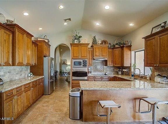 Situated in the Groves area, Thayer Estates feeds into Mountain View High School, Mesa. No HOA. Grand entry with vaulted ceilings, Kitchen features include replacement high end cabinets with ample storage, granite slab counters, stainless steel appliances, custom backsplash, custom tile in all the right places. Formal living & dining rooms, great room with wood burning fireplace & wetbar. Bonus room with bay window seat. Main bedroom retreat has den with fireplace & a 7x10' storage closet,en-suite bath has dual sinks, separate tub & shower & oversize closet. 2 AC units 1 year old. Backyard is an entertainers delight with pebble finish pool with rock water feature, covered patio, grass area, citrus trees, RV gate & RV parking pad, 2 car garage with epoxy floor, built in cabinets.