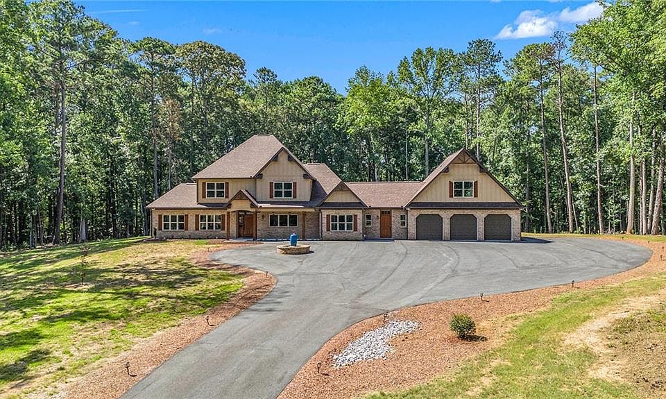 Welcome to your secluded oasis near Sunny Side in Griffin GA. You will appreciate the privacy this estate offers with a spectacular gated entrance, over 8 acres of land, with several acres already fenced. Upon entering the gate you will wind down through nature and encounter the flowing water feature in the expansive driveway. This offers a welcoming entrance to this custom 6 bedroom, 4.5 bathroom brick home. The front foyer opens up to an impressive dining room and main living area that are highlighted by built-in bookshelves and the linear fireplace. This space offers many possibilities to be broken up in ways to accommodate family or formal gatherings. The kitchen is a chef's dream with soft close cabinets, built in lazy susans and plenty of storage. The soft color stone counters, gold tone hardware and copper sink give this kitchen a functional and unique feel. There is a separate butlers pantry that offers additional storage for appliances as well as dry goods. The oversized primary suite is located on the main level and has a second liner fireplace flanked by built-in bookshelves. Both chandeliers in this room feature retractable blades when the fans are not in use. The smart bathroom includes lighted mirrors, with anti fog feature, bluetooth speakers, and ambient lighting. All bathrooms include automated lavatories with bidet features. Dual closets have plenty of custom storage. Also, on the main level you will find the laundry-room with cabinetry and a utility sink as well as an additional locking sporting goods room. Upstairs are the secondary bedrooms and additional bathrooms all have custom countertops and the same smart technology as the primary suite. There is loft space on this level that could serve as a home office or play area. There is a second foyer that offers easy access to the teen/inlaw suite. This bedroom and bathroom is located on the opposite side of the home above the garage. Outside you will find the property around the home has a wooden privacy fence, then a 6ft chain link fence in the back. There is a firepit area and a large patio space for outdoor activities. The sale will include the multiple cameras that are already installed around the property.