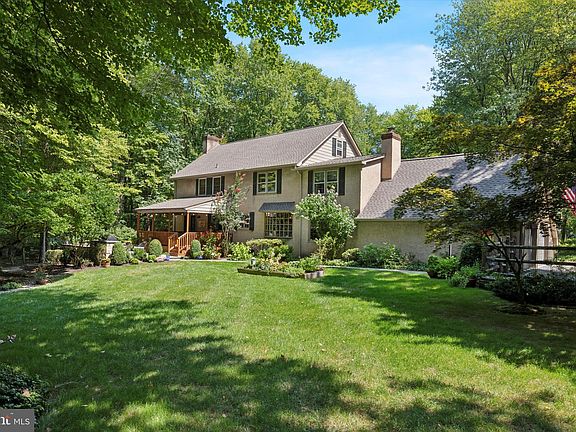 Welcome to Your Serene Retreat... Nestled at the end of a private lane, this custom Sweeney-built home from the 1960s, with its distinctive stone front, offers a tranquil escape on 1.79 lush, wooded acres. From the moment you step onto the Mercer tile floor of the inviting foyer, you’ll be captivated by the custom molding, rich hardwood floors, and built-in bookcases that define this unique residence. Every window frames breathtaking views of the surrounding nature, where in spring, you might spot fawns playing among the trees and, in winter, the graceful red fox darting through the snow. Your journey begins in the expansive living room, where a propane gas fireplace creates a cozy focal point, complemented by four large windows and French glass doors that open to a covered porch and bluestone patio accented by stone walls, custom fire pit and built-in gas grill all overlooking an incredibly private and peaceful, serene backyard. This outdoor space is an entertainer’s dream! The newly renovated kitchen is a chef’s delight, boasting custom inset cabinetry, a walnut island, soapstone countertops, and a subway tile backsplash. Equipped with Thermador appliances, radiant heated floors and a pantry, this kitchen also includes a charming bay window that frames views of your personal paradise. The adjacent family room, with its newly added built-in bookcases, brick wood-burning fireplace, and beamed ceiling, is one step down from the kitchen. Radiant floor heating and two picture windows enhance the room’s warmth and charm. A door leads to a small patio that connects to the oversized two-car garage, making errands a breeze. The first floor also features a formal dining room, a built-in bar area with custom cabinetry, a wine fridge, and a convenient powder room. Upstairs, the master suite is a haven of comfort and luxury, showcasing hardwood floors, a spacious walk-in closet, and a Carrera marble bath with a full glass shower, custom vanity and radiant floor heating. The suite also includes a bonus room currently used as a home office. The hall bath has been thoughtfully renovated with custom cabinets, Carrera marble shower/tub, double sinks, radiant-heated floors, and a built-in linen closet. Three additional generously sized bedrooms, each with ample closet space and picturesque views, complete the second floor. Recent updates include a brand-new roof (2023) with a 50-year warranty, new gutters, high-efficiency heat pump systems, hot water radiant heat, and an emergency generator hook-up. For those seeking a peaceful retreat with stunning landscaping, miles of walking trails, and proximity to the highly-ranked Wissahickon schools, Whole Foods shopping center, and SEPTA train to Center City, your dream home awaits.