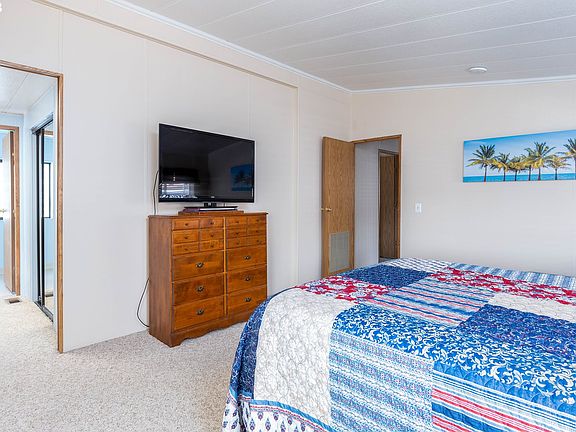 All new appliances including hot water tank. Heat pump recently serviced. Large primary bedroom with walk in closet. Primary bath has sky lights, built ins. Large covered deck. Most furniture stays including newer queen bed, TV's, electric heater, roll top desk, tons of built in cabinets, triple and double couches with recliners, tables, lamps, washer and new dryer. Low space rent includes water, garbage, sewer.