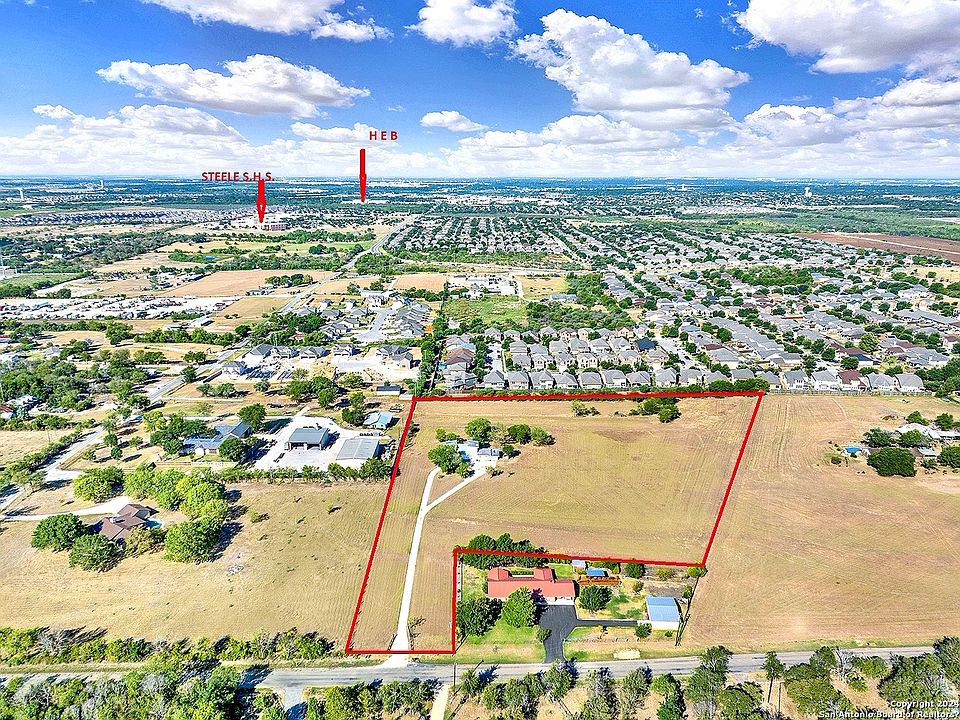 Come home to the country life without the country drive! This home has 3 beds and 3 baths with primary bedroom down and has an overwhelming amount of potential. This property is all about the LAND! Grab this 7.26 leveled Acreage of property to build onto for your family member to be close or for your next development investment! Zoned as ETJ (Extra Territorial Jurisdiction) with no HOA and NO RESTRICTIONS. If your looking to develop then this property is a rare opportunity to develop unrestricted land just outside of Cibolo City limits. There are endless possibilities including a Residential Development; Mixed-Use Development, Apartment Complex; Multi Family Neighborhood, Storage Buildings, RV Park etc. This is an extremely rare opportunity to spearhead the future direction of growth in this booming area. It's located right off of FM 1103 and zoned for the highly desired school district of Schertz-Cibolo-Universal City ISD where school buses already pick-up! Address states Marion but property is outside of Marion city limits and planned to be annexed as part of Cibolo. Will need to be platted.