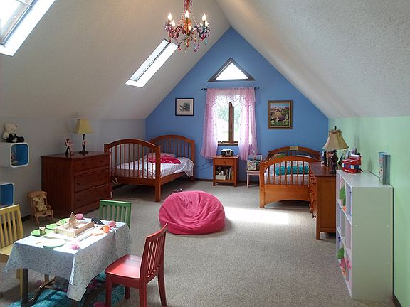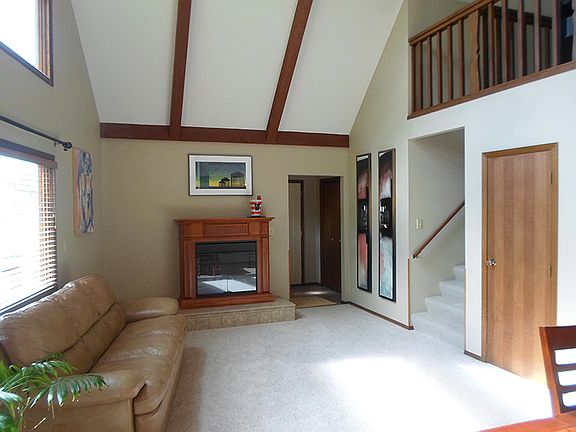 Price Reduced $10,000!!! Charming chalet-style home with a wonderful open floor plan and all the updates! Vaulted ceilings, exposed wood beams, large windows, and skylights. Stunning loft area overlooks the dining and family area. Four bedrooms (2 on main and 2 upper level and two baths (1 on each level). Beautiful interior with lots of sunlight. Kitchen has tons of counter and cabinet space, great appliances that stay, main floor laundry, as well as a large pantry.Quality details including Andersen windows and doors throughouteven in the garage. Huge fourth bedroom or game room on upper level. New metal roof in July 2013, oversized heated garage with 220. Nice landscaping, large front deck, garden in back, and a storage/garden shed. Clean and well-maintained, ready for you to move in and enjoy! Great location on the edge of town, enjoy Larchwood City Park and the new splash park just across the next street.