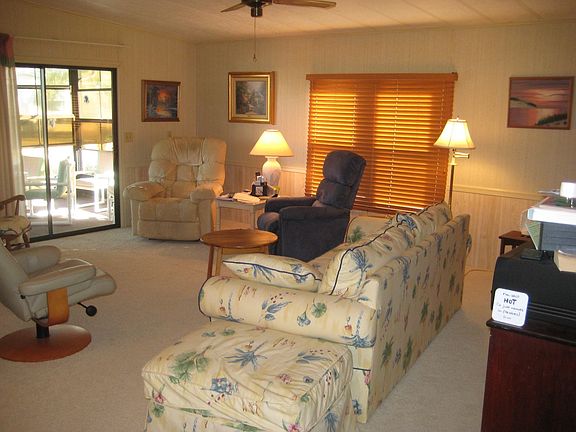 JUST REDUCED!! Turnkey Home, well equipped, nothing needed, just move right in. This home is a 1986 with 2 bedrooms and 2 bathrooms. The home has nice curb appeal, with a side driveway and carport. The front enclosed lanai is air conditioned, with a vaulted ceiling, and sliding windows allowing you to open them to enjoy the Florida Gulf Breeze. The home has a beautiful kitchen with updated counter tops, glass tile back splash and black appliances. Plenty of counter and cabinet space. The dining room is a great space to entertain your dinner guests. The built-in is large with storage underneath and shelving for your décor. The door in the kitchen and dining room leads out to the large side lanai that also has acrylic slider windows. This is a year-round room. Attached is a huge storage shed with a washer and dryer. Plenty of extra space for your tools, beach gear, bikes and holiday décor. The home has a wonderful Beach feel that is very relaxing. The beautiful light laminate floors are attractive and make cleaning easy. There are vaulted ceilings throughout the home which gives an airy open feel. Extra-large double closet in the hallway is a feature you'll absolutely love. Guest bathroom has a tub/shower combo. The guest bedroom is roomy with a step-in closet. Master bedroom is large with a walk-in closet and an ensuite bathroom. The bathroom features a step-in shower. The golf cart is included with the sale of this property. The home is not far from Harmony Hall, pool, gym, tennis courts and pickle ball courts. ACT FAST & CALL TODAY!! Don't forget to ask about the FINANCING available on this home. Colony Cove is an age qualified (55+) five-star resort community of manufactured homes. The "Cove" boasts 5 clubhouses, 6 heated pools, a riverfront pavilion and private fishing pier, a private marina, a fenced dog park (very pet friendly), tennis, shuffleboard, new pickleball courts, 2 new fitness rooms, 24 hour patrol, clubs for every interest, and much more. There are daily planned activities throughout the park. Bottom line, if you get bored here, it's your own fault!! The lot rent in Colony Cove is based on the homes' location. While the monthly rent may not be the lowest around, it's by far the best value for the money. Not only does the monthly rent cover all of the amenities of the community listed above, it also covers almost all other monthly expenses such as; water, sewer, trash pickup, all property taxes, lawn maintenance. . .pretty much every monthly expense except electricity, cable and internet. The current lot rent on this home is estimated at $1098.23 per month. All listing information given to us is considered appropriate and reliable but we always recommend home inspections by independent companies who have a background and thorough understanding of manufactured homes. We cannot guarantee the accuracy of the information given to us or the home's condition. Lot rents are determined by the community office, not our company.