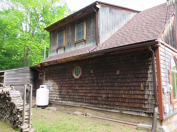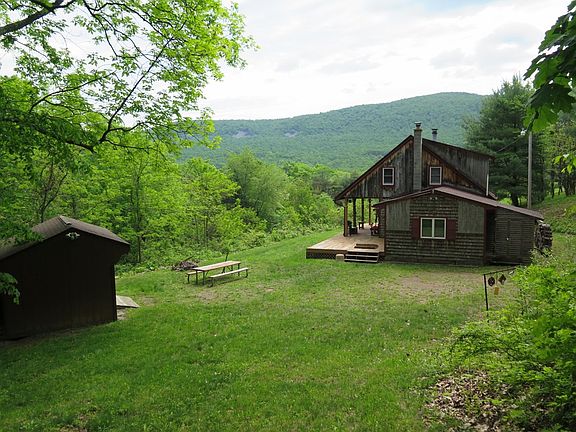 Shaker shingle sided cabin with an outstanding view of Hares Valley and Jack's Mountain. Move in ready with most furniture staying. Finished pine flooring and walls. Large bedroom on first floor with patio doors opening onto deck. Loft sleeping area will accommodate 4 or more beds. Stone fireplace and separate pellet stove along with propane back-up heaters. Sits on 2 lots totaling 4.8 acres. Security windows, large shed with tools and attached shed for more storage. Near State Game and Forest Lands and numerous trails. Travel 20 miles and you are at Lake Raystown. This is the get-away you have been looking for!