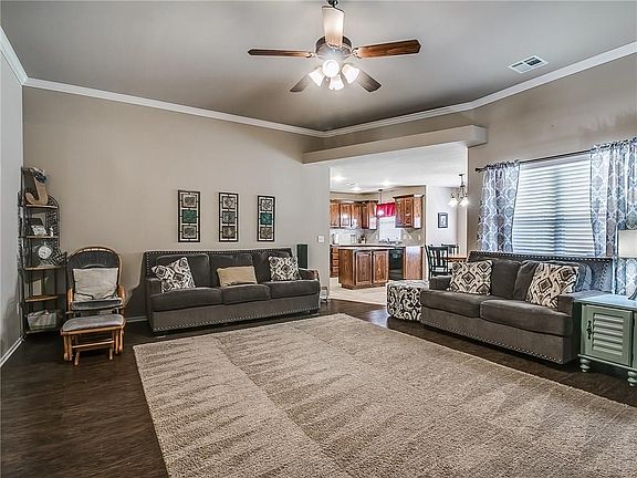 Large inviting living room with fireplace surrounded by tile. Kitchen has granite Counter tops and an island with room for bar stools. Large pantry, built in microwave and electric stove. Refrigerator, Washer and Dryer stay, as is. Living Room and hall have laminate flooring.Master bedroom is large with tray ceiling and walk around Australian closet. Secondary bedrooms have nice closets as well. Oversized laundry room with built in cabinets provide additional storage. Nice covered patio to enjoy your evenings or morning coffee. Storage building in back yard stays with property.