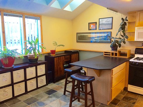 Enjoy a sun-filled, cozy single-family house in an established west Anchorage neighborhood. The entire house has vaulted ceilings and tasteful colors. An open floor plan downstairs makes the house perfect for visiting with friends and family. The beautifully updated kitchen is a joy to cook in, and the breakfast bar lets you socialize while you prepare your next meal. In-floor radiant heat makes the beautiful slate floor pleasant in the winter. The laminate floor upstairs looks beautiful and is easy to clean. Layout A large arctic entry welcomes you to the house. Two bedrooms and one full bathroom with shower/tub upstairs provide privacy and quiet. The mountain room has a large closet and features gorgeous views of the Chugach mountains, which are accessible from trailheads approximately 20 minutes away. The west room is spacious and has views over the backyard along with a loft for additional storage/hang out options. Every room has south facing windows and some rooms have skylights to make the most of Alaska's sunlight. The downstairs features an open kitchen, comfortable living room, dining room, and pantry/laundry/utility room. The kitchen has beautiful granite countertops, large stainless steel fridge, stainless steel double sink, high-quality dishwasher, and microwave. The efficient on-demand water heater and washer/dryer add to your convenience. The large yard is fully fenced with an oversized deck, which is perfect for barbecuing while enjoying the evening sun and playing yard games. A large shed with electricity is available for your use. You can access a paved multi-use trail right across the street, which connects to the 9-mile long scenic Coastal Trail. The house is approximately 1 mile from Kincaid Park and is zoned for excellent schools (Kincaid Elementary, Mears Middle School, and Dimond High School). Renter is responsible for natural gas, electricity, Wifi, and trash/recycling. House is on well and septic, so there is no fee for water/sewer.
