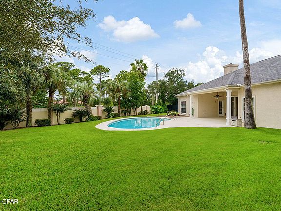 Currently under contract, seller will consider back up offers. This immaculate one-owner home is nestled at the end of a culdesac within the community of Palm Bay- a highly desirable neighborhood off of North Lagoon. With 10' ceilings throughout, and boasting a spacious corner lot with large pool, this is the perfect place to call home. The single level home in pristine condition offers four bedrooms, two and a half bathrooms and a split floor plan with wood flooring throughout. The kitchen offers custom cabinetry with granite countertops and opens to the living and dining areas to create the perfect atmosphere for entertaining. Open the sliding doors to the oversized, covered patio where you'll enjoy cooking out and relaxing while overlooking the lush landscaping and pool. This home has been kept in excellent condition by the owner. Double pane windows and a new roof added December 2018 and hot water heater has been replaced recently. Positioned perfectly off N Lagoon, you'll be a few miles from the sugar white sands of Panama City Beach and also from a public boat ramp. Make the most of Florida living in this incredible opportunity to live in the Palm Bay community!