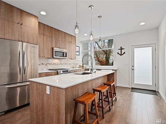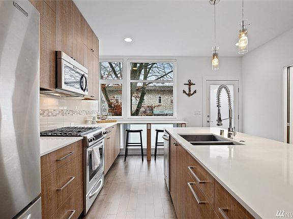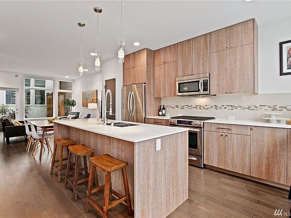 Spacious & modern townhome in the heart of vibrant Greenwood neighborhood. BuiltGreen certified for energy efficient, sustainable living. 9 foot ceilings & large windows offer abundant light on every level. Open concept kitchen w/ SS appliances, large center island & spacious pantry. Engineered hardwood floors, mini-split heating/AC and half bath on main level. 2 bedrooms plus full bath on 2nd level. Luxurious top-floor Primary Suite w/ vaulted ceilings, walk-in-closet, spa-like bathroom w/ rain shower & heated floors plus large private deck w/ Cascades views. Designated, covered parking space & extra garage storage. Close to everything Phinney Ridge has to offer - cafes, restaurants, zoo, transit. Walk Score of 96!