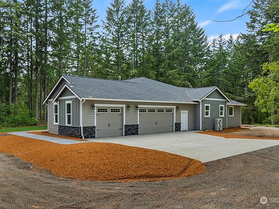 Peaceful, wooded site. Live more independent than many. No hoa, your own well and septic. Single story home trimmed with quality finishes and so much cabinetry. Quartz counters, high-end range, convection oven. Extensive wood plank laminate (waterproof) flooring throughout the home with carpeting only in the bedrooms. 4 bedrooms, or alternatively 3 plus a den. Crown molding, chair rails, and wainscot paneling trim. Several potential shop locations. Near both Puget and Zittle’s marinas.