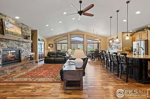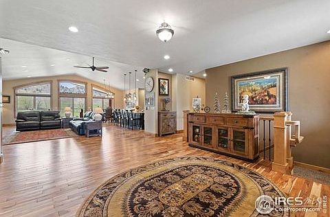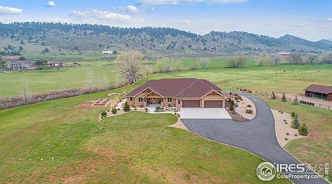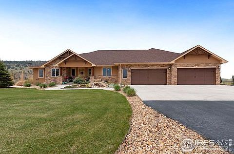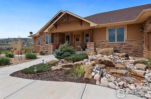 Rare opportunity to own a stunning ranch on 4.74 acres with unobstructed views of the foothills in one of Northern Colorado's premier neighborhoods. No detail was overlooked in the construction of this home. Main floor features 2 master suites, an additional bedroom with en-suite bath, great room with floor-to-ceiling stone fireplace, beautiful kitchen with walk-in pantry, a spacious study, and a 10+ car attached garage with rear-load RV bay. Basement features a kitchenette, expansive rec room, an additional bedroom with full bath, and plenty of storage. Enjoy the incredible sunsets or gazing at the wildlife from the large covered deck. Zoning allows up to 4 horses and HOA allows for an additional outbuilding with approval. Irrigation water is available through HOA.