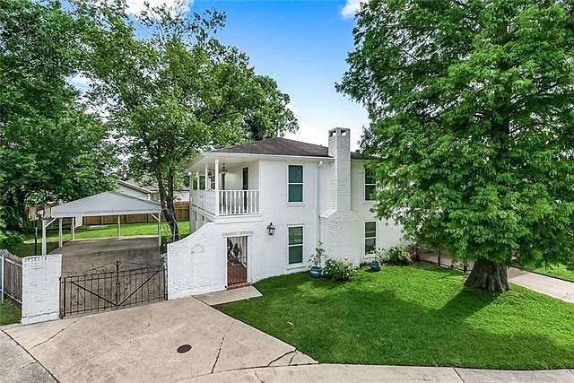 Sharp looking white brick with wrought iron accents in desirable Harahan Oaks subdivision. Drive to the rear ends under a double carport. Master bedroom suite has jetted tub and double vanities, also has balcony access, as does another bedroom. Separate dining room and breakfast area with sunroom off of dining room. Large, fenced back yard, kitchen has stainless steel appliances and ceramic backsplash over granite