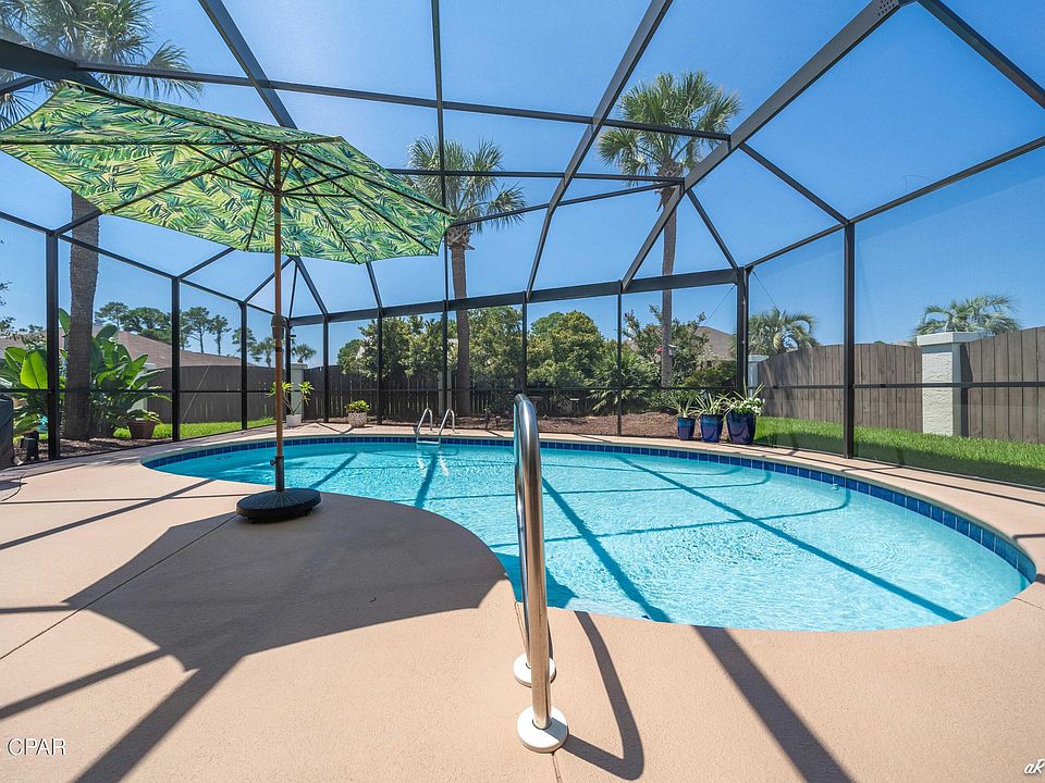 12 foot ceilings in foyer and living room, 10 foot ceilings throughout rest of house, crown molding, ceramic title in foyer, kitchen, bathrooms, with laminated flooring in bedrooms and den, large master bedroom with master bath that offers garden tub, jacuzzi and separate shower. The additional bedrooms are well-appointed and offer comfort and privacy for family members or guests, plus bonus room/office. One of the highlights of this property is the outdoor oasis that awaits you. Step outside to discover a private pool, perfect for cooling off on hot summer days or enjoying a relaxing swim. The pool area also provides ample space for lounging, sunbathing, or hosting poolside gatherings with friends and family. Palm Bay neighborhood offers a tranquil setting with beautifully landscaped streets and a welcoming community atmosphere that is golf cart friendly. Residents here enjoy easy access to nearby shopping centers, restaurants, grocery stores, entertainment options, and, of course, the stunning beaches of Panama City Beach. Don't miss the opportunity to own this exceptional home with a pool in the sought-after Palm Bay neighborhood.