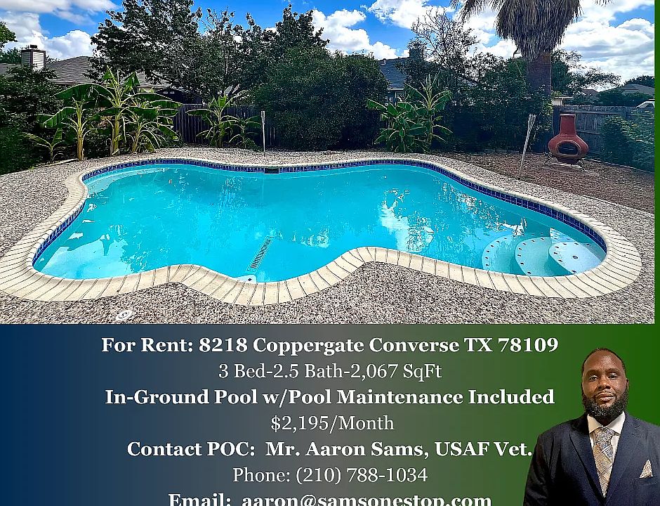 3 bedroom home available with flexible screening criteria related to credit and background. No HOA! This home features an outdoor oasis with an in-ground pool with pool maintenance included in the rental price. Master Bedroom is located on the first floor with a walk-in closet and an exit/entry door to the backyard pool. Master Bathroom features dual vanities, and a separate tub and walk-in shower. Open floor plan with over 2,000 SqFt of living space! Upstairs features a spacious loft that can be used as a study/office or as a game room for additional family entertainment. Remaining two bedrooms are located upstairs with an additional full bathroom. Laminate floors throughout the home with carpet only on the stairs. Home is conveniently located close the Forum, Joint Base San Antonio-Randolph, and Joint Base San Antonio-Ft Sam Houston. No pets allowed. This home is available to tenants with a combined household income of at least $6,500 per month.