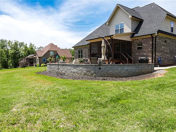 This beautiful brick home is located at the end of a lush subdivision street offering ample privacy on a 1.9 acre lot. This stunning home features a spacious open kitchen and great room, perfect for entertaining. The main floor includes a luxurious primary suite with an elegant bathroom and large walk-in closet. Architectural details like coffered ceilings and wainscoting enhance the charm, while granite countertops add style to the kitchen. Enjoy the screened-in porch that leads to a generous patio with accent lighting. Located in an appealing neighborhood, this home offers plenty of space for gatherings and a private backyard retreat. Conveniently located near Oak Ridge Commons, Stonefield Cellars Winery, NC 68 and NC 73.