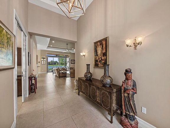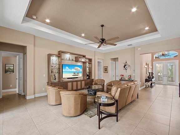 Striking in scale and luxury appointments, this stunning Julia model has 3 bedroom, plus den, 3.5 bath home has everything required for the premier Valencia Cove lifestyle. Pass through the glass double door entrance to discover an open floorplan designed for easy entertaining with a formal dining room, a spacious great room, a den and a screen enclosed patio. Dream kitchen features quartz countertops, stone tile backsplash, under and above cabinet lighting, center island, stainless steel appliances, double oven, a breakfast nook and snack bar. The primary suite boasts a custom coffered ceiling, motorized black-out shades and custom his and hers walk-in closets The opulent master bath provides dual sinks with quartz counters, walk-in shower and a large linen closet. Porcelain tile laid on the diagonal, high hat lighting, smooth walls, impact windows, bedrooms with en-suites, extended garage and an abundance of natural light complete this immaculate home.