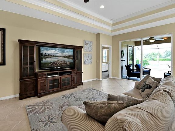 A resort-style life awaits you at Stoneybrook, a gated community within Heritage Harbour surrounded by shimmering ponds and an 18 hole golf course. The open floor plan in this beautiful home welcomes you with large, diagonal tile flooring and tray ceilings with crown molding. You'll enjoy the view of your pool and a pond from sliders in the family room, living room, AND master bedroom. Relax in your master bath with a garden tub, shower, and dual sinks. The kitchen overlooks the living areas and includes stainless steel appliances. You'll also find a convenient sink in the laundry room! The DEN could easily be used as a third bedroom in this 2 bedroom, 2 bathroom home. Close to Interstate 75, Stoneybrook offers fantastic amenities for residents to enjoy including a Jr. Olympic size pool, whirlpool and 24hr fitness center, an in-line skating rink, beach volleyball courts, lighted tennis and pickleball courts, basketball, bocce ball, corn hole, picnic areas, and playgrounds. The dog park is right around the corner, and a 70 acre fishing lake is down the street next to the soccer and baseball fields. Don't miss out on this gorgeous pool home and activity rich community!