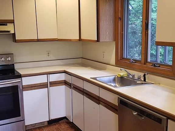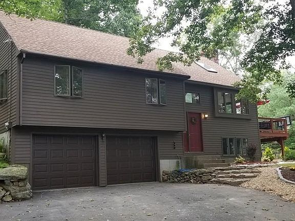 Contemporary split entry located on a wooded country lot. Large living room with a cathedral ceiling, fireplace and two sliding glass doors that lead to an expanded party sized side deck which make this space perfect for entertaining. Features include hardwood flooring, skylights, finished lower level with interior access to the two car garage. New roof, recent furnace/hot water & garage doors, updated deck and hardwood flooring.
