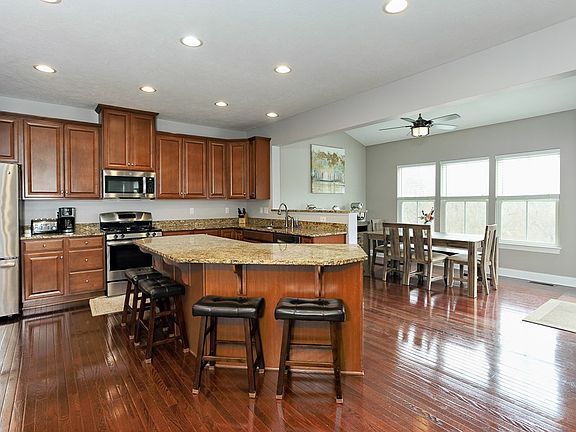 Gleaming hardwood floors great you upon entry and lead to a dining room with chair rail, large open kitchen with granite countertop island and the cozy great room with stone fireplace. The added space of the sunny Morning room can accommodate a reading area, homework area or dining table. The first floor is rounded off with a dedicated office space surrounded by windows. Upstairs you will find 5 inviting bedrooms, the laundry room, a hall bath and primary bathroom with large walk-in closet. The finished basement is ideal for entertaining with a theater, bar and full bathroom. The side yard has plenty of room for a swingset, hot tub or pool. The added wooded lot space with fire pit creates a private outdoor area.