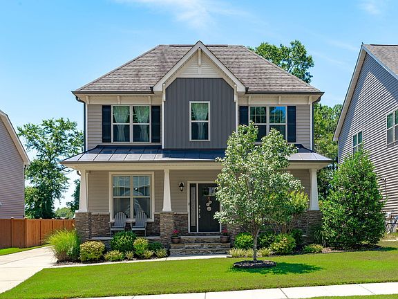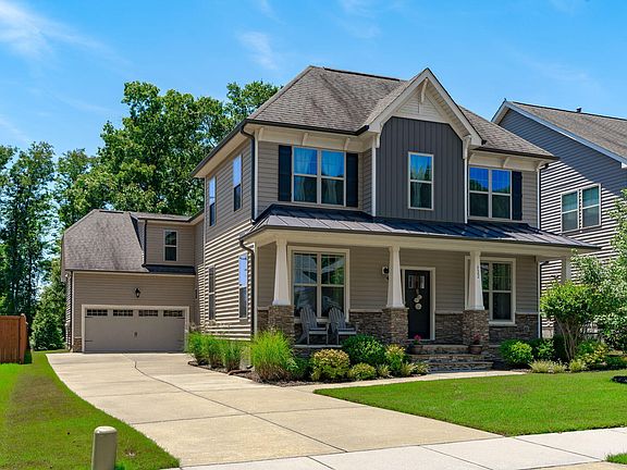 A masterpiece of design and quality craftsmanship is displayed throughout this model-like home with approximately $60K in builder upgrades. Nestled on a private cul-de-sac street with peaceful water views of a nearby pond! An expansive driveway along with a 2-car attached garage ideal for multiple vehicle parking. The southern front and back porches are covered and open allowing for outdoor living spaces to relax and entertain. Walk into an elegant entry with crown molding, transom windows, and an offset staircase leaving plenty of room to welcome guests. A private study with French door entry is off to the right and perfect if working from home. The formal dining room is abundant in natural light with a modern molded ceiling and joined to the gourmet kitchen by a Butler's pantry. Enjoy casual meals at the breakfast area or quick bites along the center island, lots of storage, double built-in ovens, gas cooktop, Stainless Steel appliances, herringbone tiled back splash all with neutral tones to compliment any design pallet. Spacious family room with gas log fireplace creating a warm and inviting atmosphere. Owner's suite on the second floor showcasing two walk-in closets, dual vanities, stand alone tub, walk-in shower, and private water closet. Two additional bedrooms, full bathroom, and an over-sized bonus room complete the top floor. Minutes from Downtown Fuquay Varina with locally owned and retail shopping, fine dining and restaurants, breweries and town parks.