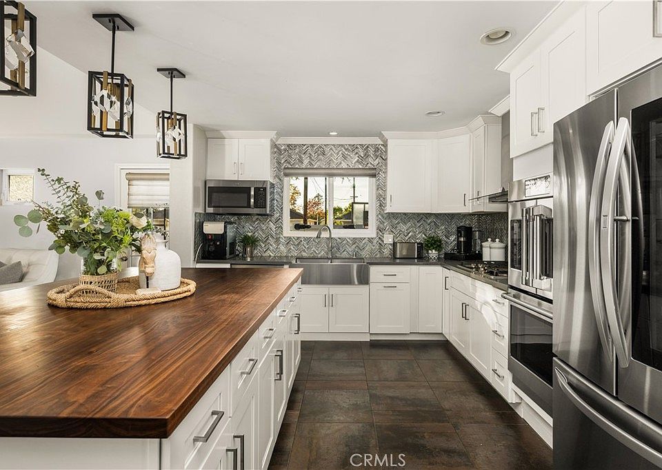 Nestled just a short distance from Old Towne Orange, this beautifully renovated four-bedroom, two-bath home, blends modern finishes with timeless charm. An inviting open-concept layout welcomes you inside, highlighted by a spacious great room with a cozy fireplace- perfect for gatherings or relaxing evenings at home. The showpiece kitchen is designed for both function and style, anchored by a large 5 ft. x 8.5 ft. island featuring a warm butcher block countertop complemented by sleek white kitchen cabinetry, quartz countertops, glass-tile backsplash, and top of the line appliances including a bakery-style double oven. Enjoy the added comfort of a separate living room with hardwood floors, French doors, and a secondary fireplace OR use this versatile space as a home office, gym, or playroom. The spacious bedrooms feature gleaming hard wood floors, fresh paint, and ample closet space. Some of the newer upgrades include a tankless water heater, water softener, living room sliding doors, additional 100 AMP electric panel, all light fixtures upgraded, updated plumbing throughout, air conditioning, indoor laundry closet, and more. Out back, a lovely and low-maintenance backyard awaits with newer vinyl fencing, durable artificial turf, and a pergola for outdoor gatherings. With its corner-lot setting, modern finishes, and thoughtful improvements, this home is a rare find combining warmth, style, and everyday convenience. Nearby is Chapman University, the historic Plaza which features annual holiday events, shopping, and a wide variety of restaurants. Fall in love and make this your new home!