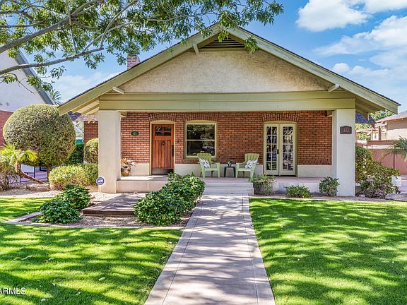 So many options with this incredible property! Currently an office, the existing zoning allows residential, office or even coffee shops and retail! Built circa 1913 and professionally restored in 2005, the quality of this brick bungalow is nearly unheard of in Phoenix! Main house is 1574 sq ft with 3 beds and 2 baths plus den and studio in back is an additional 324 sq ft with wetbar, perfect for home office or art studio. Live/work opportunity! Special features include real wood floors, custom tile in both baths, claw foot tub, oiled soapstone countertops, 5 panel doors, oiled bronze hardware, original woodwork, stone fireplace, beautiful light fixtures. Also has underground utilities, automatic gate, private lush yard, good parking and a 1961 BOMB SHELTER! Incredible unique property!