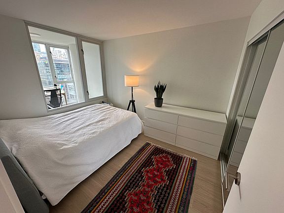 Fully Furnished 1 Bedroom + 1 Bathroom, at the corner of Robson and Seymour. 11th floor unit in a quiet 13th floor building. Includes a solarium that can be used as an office or 2nd bedroom, and has a den that can be used a storage area. With brand new flooring and fresh paint. Fully equipped kitchen with fridge, dishwasher, oven, gas stove, and microwave. Washer and dryer. All utilities + internet are also included. Shared amenities include gym, meeting room, bike storage, and a peaceful courtyard on the 4th floor. Looking for tenants who are very clean and treat the unit like their own home. No shoes or smoking allowed inside. Half of the first month's rent is required in advance for security (damage) deposit. The unit is spacious and unique