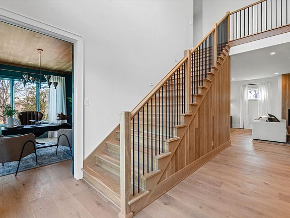 Wide-plank white oak floors, tailored millwork, and generous ceiling heights define the main level, where living spaces flow effortlessly to the outdoors. The kitchen is both sculptural and highly functional, finished with slab marble surfaces, custom cabinetry, professional-grade appliances, and a substantial island designed for daily living and relaxed entertaining. A discreet scullery and walk-in pantry add depth and utility without interrupting the home’s clean visual rhythm.