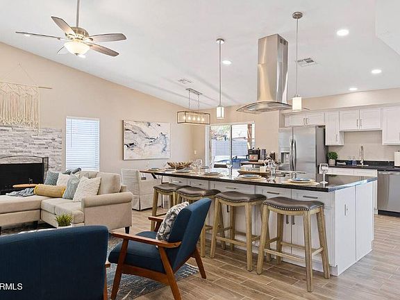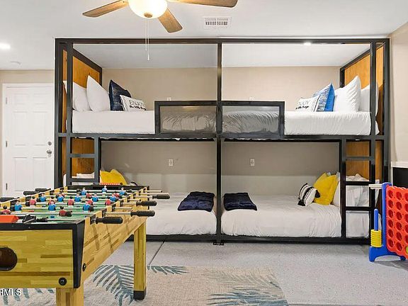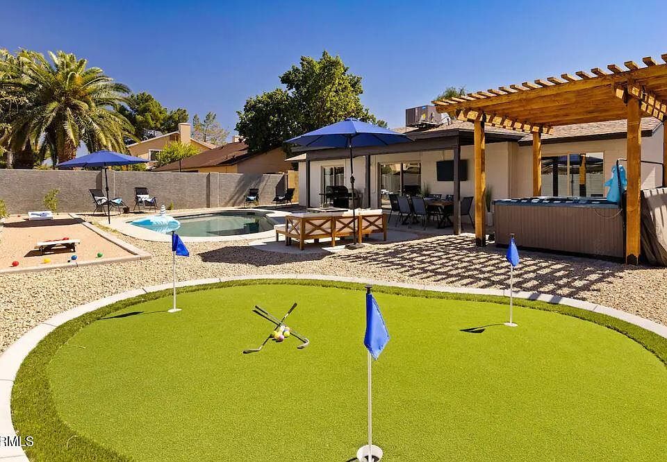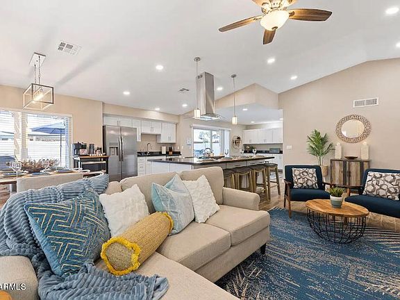 Wonderful opportunity to own in quiet Mesa neighborhood-FULLY FURNISHED -successful vacation home. Mesa Coastal Retreat offers a ''coastal vibe'' throughout. 3 main bedrooms and one supersized bunk-room with custom metal 4 full size bunks. Backyard oasis with swimming pool, hot tub, putting green, corn hole and bocce area. Fully renovated in early 2022. White shaker cabinetry, granite tops, stainless appliances, fireplace, vaulted ceiling and more. Take advantage of passive income or settle down in this beautiful home with great schools, close to freeways, shopping, dining and more. Please be patient when scheduling as it may be booked.