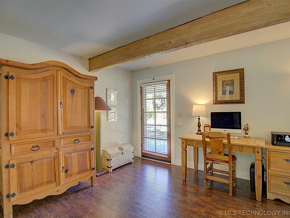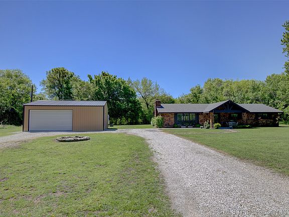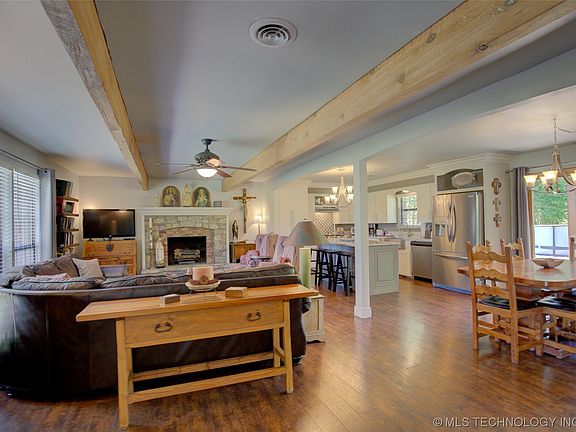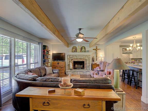 Beautifully Renovated! This spacious, open concept home has real wood beam ceilings, a gorgeous custom fireplace, a beautiful granite kitchen with large island, large windows, and natural light throughout. There are two amazing Chalet style covered porches to relax when you get home. This home also features a 3 year old 24 x 30 pole barn, 4 x 6 Family Safe walk in storm shelter, and extra lighting. This home is surrounded by mature trees on all sides, you'll feel like you're out in the country, but with all the conveniences of the surrounding cities, and just 20 minutes to downtown Tulsa!