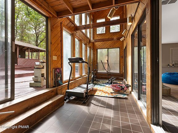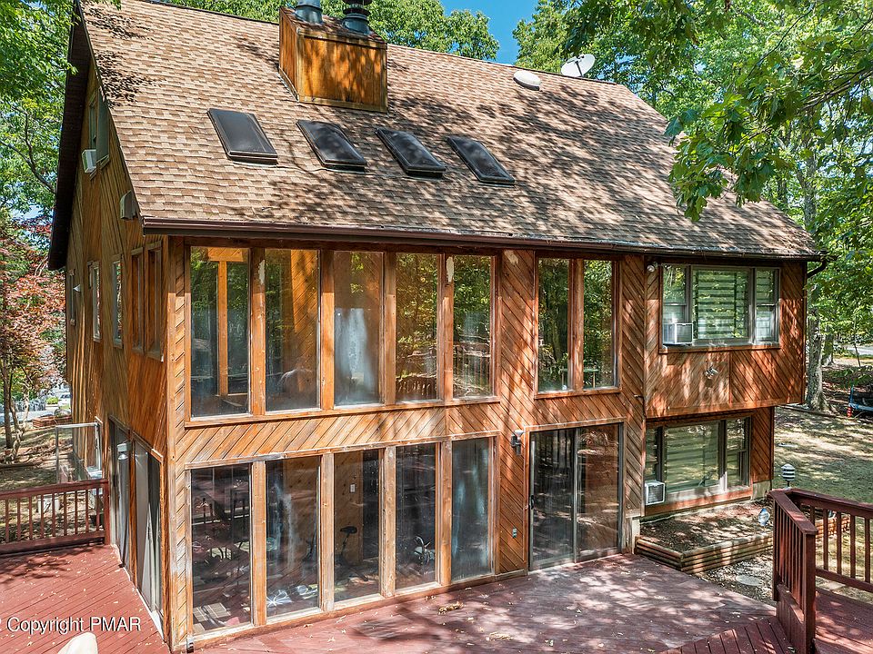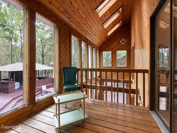 Enjoy all 4 seasons in this uniquely designed contemporary, with an amazing 3 story sunroom w/ 4 skylights, 2 walls of sliders off of the LL family rm. Extensive decking that has a gazebo with a hot tub area. The living rm is open to the dining area and the modern kitchen. It has a FP, a floor to ceiling window and a balcony that looks into both the LL and upper level of the sunroom. The family rm has a woodstove and a slider to the side deck. There are 5 spacious bedrooms and 3 full baths. The 1st floor bedroom has a walk-in closet and a slider to the balcony looking into the sunroom. There are 2 bed. on the 2nd fl. and 2 bed. on the LL, one has a slider to the sunroom. Home is on .64 acres with a greenbelt area behind it.