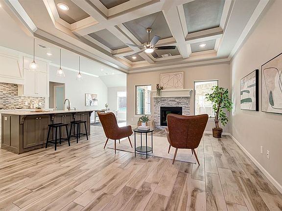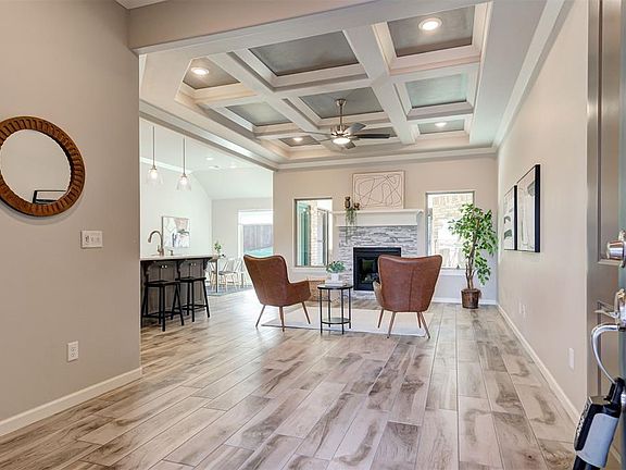 Step into this beautiful Hummingbird Bonus Room floor plan in North East Edmond's Woodland Park Community! This Hummingbird Bonus Room 2 floor plan which includes 2,284 Sq Ft and 245 Sq Ft of outdoor living space. Home has 4 bedrooms, 2 full bathrooms, & 3 car garage with storm shelter installed. The outdoor covered area has been enclosed with a mini-split heat and air unit installed to allow for year round enjoyment. The living room has a coffered ceiling, wood look tile, a gas fireplace with stack stone surround, 2 large windows, & barndoor. The kitchen has built in stainless steel appliances including a built in gas range, electric oven, microwave, & dishwasher. Decorative backsplash, 3cm quartz counter tops, farm sink, custom vent hood, cabinets to the ceiling. Master suite boasts a slope ceiling detail & an attached bathroom with a dual sink vanity, walk in shower, whirlpool tub & walk in closet. Other amenities include Tabertech Smart Home technology, whole home air purification, Rinnai tankless heater, & R44 insulation. The homeowner also enhanced the entry by adding concrete stairs! Angie Baughman Miller with Financial Concepts Mortgage is offering 1% in closing costs to any buyer who uses her for financing.