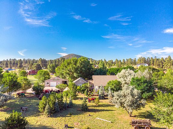2 homes on this amazing property. The main house is a 4 bedroom, 2 bathroom single level home that has 2 large living areas, a big kitchen and master suite. It is over 1900 square feet. Both the living and family rooms have vaulted ceilings. The kitchen has lots of storage, counter space and all appliances are included. There is an attached 2 car garage. Out back, there is a 1 bedroom, 1 bathroom guest house, and a huge 2700 square foot shop and garage building. This would be perfect for the car enthusiast, crafts person or home based business. Between the buildings are walkways, seating areas and tall trees to provide lots of shade. Located on a huge 2.64 acre lot, this home borders the Rio De Flag stream, has a small pond and is close to the national forest and Flagstaff!