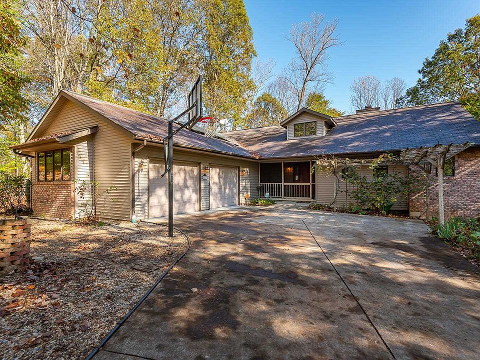 This distinctive 3-bedroom, 2-bath hilltop retreat on 7.38 forested acres is just 15 minutes from Indiana University, downtown Bloomington, and Lake Monroe. A screened porch at the front opens to a large landing with vaulted ceilings. The living space, all contained on the main level, features hardwood cherry floors throughout, a soapstone clad fireplace with a wood-burning stove insert and wood-framed windows that celebrate the four-seasons setting. The great room is open to the dining area and kitchen, which features white cabinets, double ovens and a walk-in pantry. The home offers a central vacuum system, both geothermal and solar energy sources, and a state-of-the-art Finnish wood-burning sauna cottage. There are two 58' x 12' recently (2019) stained wood decks on the lower and upper levels, as well as a screened porch with a "tree house" feel off one of two generous bedroom suites. One of the bathrooms was recently remodeled and features heated tile floors and a copper sink. There is a very large dry and naturally cool workshop and storage basement, as well as a spacious two-car garage that includes a recently (2020) treated slip-resistant surface. Walking trails line most of the serene and private property with significant landscaping upgrades, including native perennials, Hugelkultur-type raised garden beds and rainwater management systems to protect against erosion. Included in the price: Bosch washing machine, Maytag dryer, LG refrigerator, Bosch dishwasher, and Kenmore chest freezer.