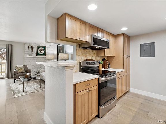 Welcome to this beautifully updated, move-in ready first-floor condo, located in the Woodside Village II community! This cozy 2-bedroom, 2-bathroom, 1019 sq ft unit features an open and spacious one-level floorplan with new white oak wood floors and baseboards throughout. The updated galley-style kitchen has light wood soft-close cabinets, Corian counters stone tiled backsplash and newer stainless steel appliances, including a Bosch dishwasher, counter-depth refrigerator, microwave, and induction oven. The kitchen opens to your dining and living rooms, both great spaces for relaxing and entertaining. Down the hall, enter through French doors into your spacious primary suite, which includes an 8'x5' walk-in closet, new Marvin window with cordless top-down bottom-up shade, as well as a charming west-facing flower box window, perfect for the afternoon sun. The ensuite bathroom features an updated tiled over-sized walk-in shower with sliding glass door. The second bedroom offers plenty of room for guests, perfect as a sewing space, office, or workout room. Across the hall is an updated second bathroom with a shower/tub combo, and tile surround, and adjoins the laundry room with a newer Samsung stackable washer and dryer. The living room and second bedroom features new Marvin sliding doors that open up to your private covered patio, for easy indoor/outdoor living. The patio also includes a personal storage closet. Nest smart thermostat recently installed. Your reserved parking space is located down the walkway from your front door. Great location with the community pool around the backside of the building. Enjoy walks along the Highline Canal and plenty of nearby dining and shopping…Minutes to Lowry, Cherry Creek, Hwy 225…Easy access to DIA and downtown. Come see for yourself why this fabulous home is perfect for you!