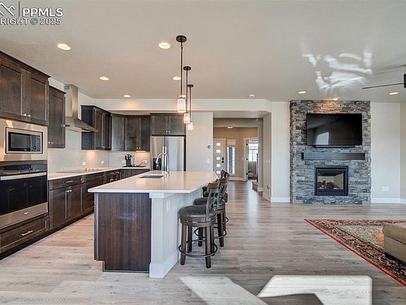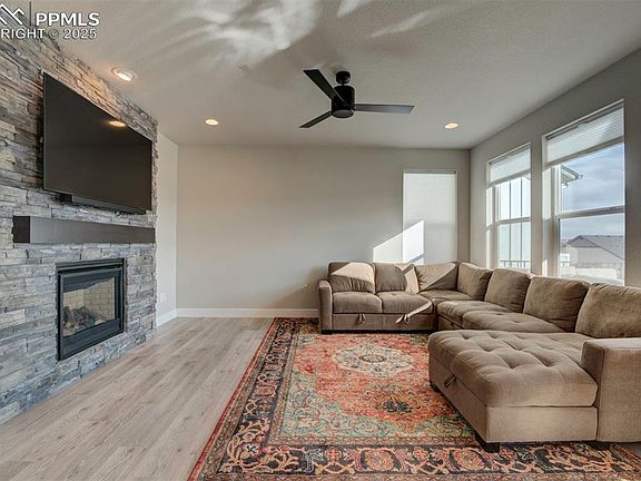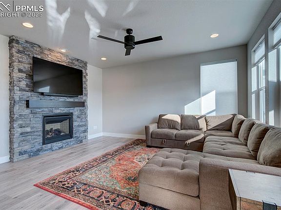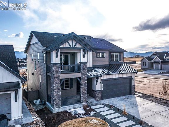 Welcome to your new home! This beauty sits on a 6000 Sqft lot backing to open space/park with breathtaking Pikes Peak mountain views all year around! This two story floor plan has a ton to offer with many upgrades! When you enter the home you will be greeted with a covered front porch/ entry. When you step inside you will notice an office space along with gorgeous LVP flooring throughout! Open concept layout with a large kitchen island that boasts Quartz counter tops and upgraded cabinetry! Living room faces west with fantastic mountain views and a stone veneer fireplace to enjoy! As you head upstairs you will notice 4 bedrooms plus a loft! Large master suite offers a private covered front deck. Accompanied by a master bath set up that is to die for. The backyard has full privacy fencing along with a Garden Level Composite deck that you cant go without and is an absolute must to enjoy the beautiful mountain views! Don't miss your chance to be in D20 with a better than new turn key home!