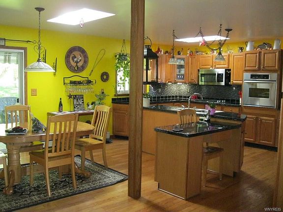 Beautiful 3 bedroom 1.5 bath ranch on gorgeous park like one acre setting! Enjoy summers on the covered deck overlooking the plum, apple and pear trees. Spacious, open country kitchen and dining. Updated kitchen has skylights, tiled back splash, new microwave, new dishwasher. Oven-2010. Countertops is epoxy covered cement that looks like marble. Sliding doors from dining area open to deck. Two story 24 x 12 barn has concrete floor & electric. Hardwood floors throughout except in the family room. Yard backs up to woods and a farm. French drain system in yard. Kohler awning 2014. Extra wide driveway. You will love the open feeling between the kitchen and dining area. Lots of cupboard space and counter top for food preparation. Enjoy a lovely family room as well as a living rm.