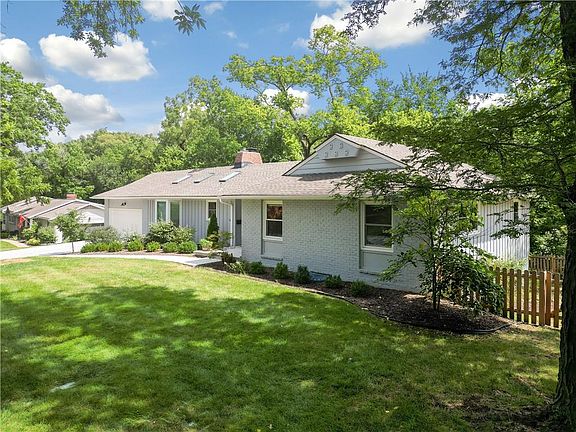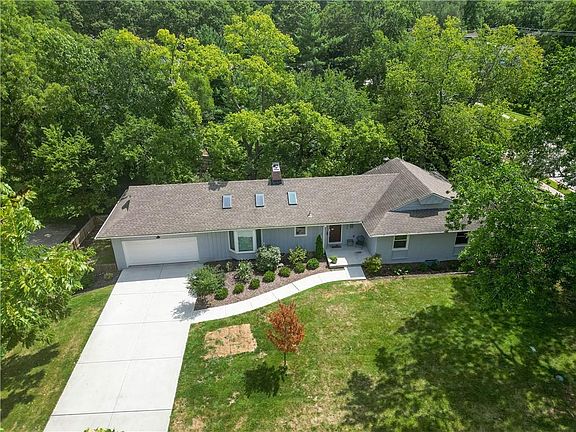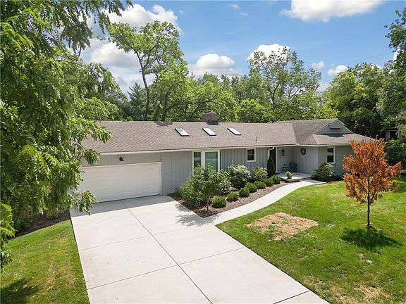 BACK on the market AT NO FAULT TO SELLERS!! The seller has reconfigured the kitchen, cutting the countertop to accommodate a standard-size fridge, and added a wine fridge to the downstairs wet bar. Nestled on a serene half-acre wooded lot in the heart of Leawood, this updated ranch home blends timeless charm with modern convenience. Step inside to refinished original hardwood oak floors and an expansive living room centered around a stunning brick see-thru gas fireplace. Floor-to-ceiling windows in the dining room frame breathtaking views of a lush, wooded creek. The reconfigured modern European kitchen features striking black soapstone countertops, a gas range, double ovens, and ample storage. Vaulted ceilings with skylights flood the living and dining areas with natural light, while built-in Bose surround sound enhances the entertainment experience. The main level offers three spacious bedrooms, including a primary suite with an en suite bathroom, plus a vintage-inspired full hall bath. The remodeled walk-out lower level expands the living space with a versatile family room, wet bar with a new wine fridge, cozy TV den with built-in surround sound, a fourth conforming bedroom or office, and a third full bathroom. A separate laundry room and a man cave workshop with extensive storage complete the lower level. Step outside to a private backyard oasis, enclosed by a newer cedar fence, and enjoy scenic views of Dyke Branch from the newer deck. Additional updates include freshly painted interiors (2022), a newly pointed chimney, and a brand-new sewer line. Don't miss this rare opportunity—schedule your showing today!