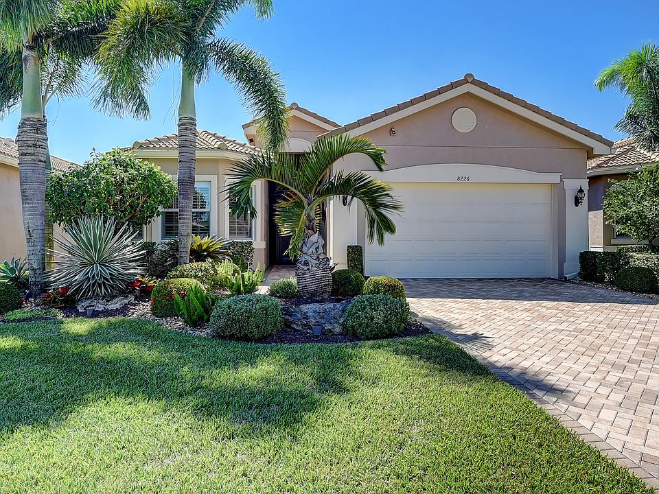 Valencia Cove highly desired BIMINI model-3 Bedrooms plus Den/Office, 3 full bathrooms. Beautifully landscaped with water view. Wide open Great Room with dining area and eat in kitchen. Custom closet built ins, impact windows, screened in patio and front entrance. Light, bright kitchen, light porcelain flooring, crown molding and numerous upgrades. Wired alarm system. Laundry room with W/D, sink and storage. Finished garage floor with storage cabinets. Valencia Cove is the premier 55+ active adult, luxury, gated community. Some of the community amenities include the Bistro which offers table dining service (inside/poolside/takeout), 3 heated pools including a resistance walking pool, fitness center, canasta, card rooms, pickle ball, bocce, tennis, basketball, ping pong, volleyball & MORE!