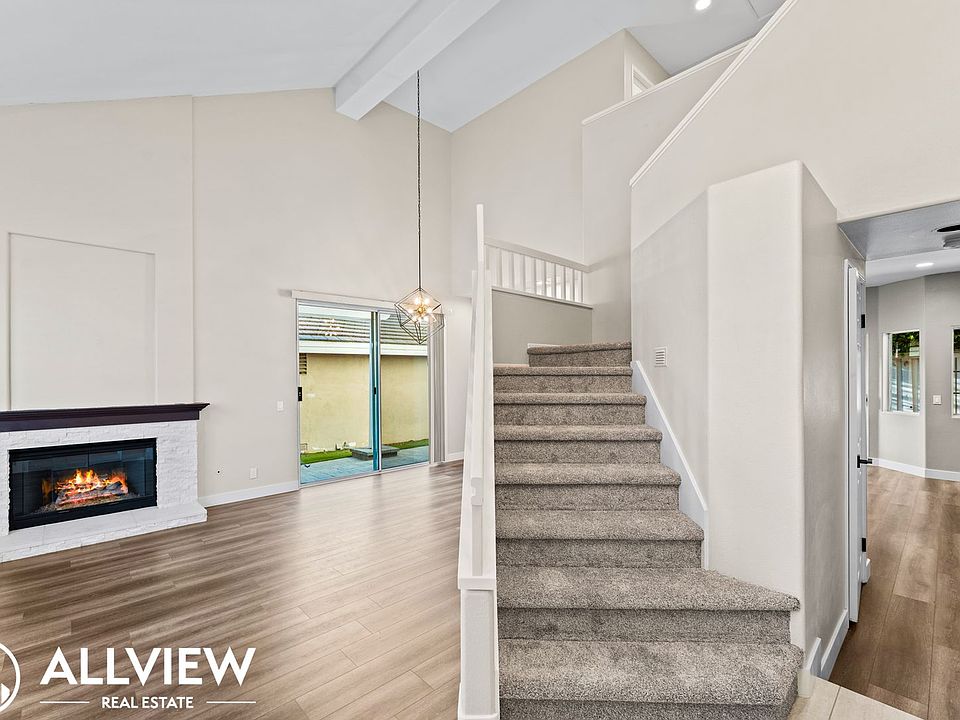 Welcome to this stunning 3 bed, 2.5 bath home located in the Santiago Hills area of Orange! As you enter, you're greeted by the formal living room boasting vaulted ceilings, vinyl plank flooring, recessed lighting, and a cozy fireplace. Perfect for relaxing or entertaining guests. Adjacent to the living room is a dining area with a sliding glass door that opens to the backyard, offering seamless indoor-outdoor living. The modern kitchen is equipped with sleek stone countertops, stainless steel appliances, and pristine white cabinetry. Off the kitchen, you'll find a comfortable family room with another sliding door leading to the backyard, making it ideal for gatherings or quiet evenings at home. The first floor also includes a convenient half-bathroom with stylish stone countertops, recessed lighting, and tile flooring. Upstairs, you'll discover that the entire level has been updated with brand new carpet. The primary suite comes complete with vaulted ceilings, a ceiling fan, and a generous walk-in closet. The luxurious en suite bathroom features a double sink vanity, a walk-in shower, and a soaking tub for ultimate relaxation. Two additional bedrooms upstairs, each with vaulted ceilings, ceiling fans, and organized closets, provide ample space. The secondary bathroom also offers a double sink vanity and a beautifully tiled tub/shower enclosure. Additional features include a 2-car garage with an EV charger, a dedicated laundry room with washer and dryer included, smart home thermostats and lighting controls, a water softening system, and energy-efficient solar panels. This property offers not only a beautifully updated interior but also an unbeatable location near a wealth of amenities. Just a short distance away, you'll find Chapman Hills Elementary, Irvine Regional Park, and the Peters Canyon Trailheads, perfect for outdoor enthusiasts who enjoy hiking, biking, and nature. Commuting is made easy with quick access to the Toll Roads, and you're also conveniently close to nearby shopping and dining options. Don't miss your chance to make this exceptional home your own!