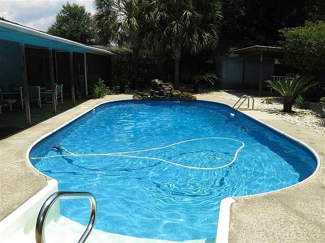 Beautifully Renovated/Updated four bedroom; three bath home with two Master Bedrooms; Split Floor Plan and Huge Great Room overlooking the lushly landscaped back yard, Sparkling pool with Waterfall and High End Hot Tub. Great Room is 37'7'' x 13'7'' with wood burning Fireplace. Master Bedroom features tile with beautiful decorative accents, real Palm ceiling fan light. Crown Molding and French Doors leading out to the spacious and inviting Tiled and Screened Patio overlooking the covered deck and pool and hot tub. The back yard is gorgeous and features a Gazebo with wood swing, sunbathing deck, grilling area. Large Workshop/Storage Shed with Fort overhead. Bar with Storage, nautical decorations, patio furniture, covered pool equipment and Polaris! Kitchen was totally gutted and