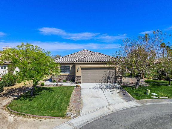Fully furnished and ready for move-in, this newer upscale home offers enviable short-term-rental opportunities behind the impressive guard-gated entry of Indio's prestigious Indian Palms Country Club and Resort. Just a short stroll from the Empire Polo Club, which is home to the internationally famous Coachella and Stagecoach music festivals, the open-concept single-level residence is settled on a cul-de-sac homesite of almost 8,712 square feet-larger than most in the neighborhood. Colorfully landscaped grounds are extra private, making it easy to enjoy a pool and spa with waterfalls, a shaded loggia, paver-finished patios, a lawn, open-air fireplace and welcoming side entrance. The interior is just as desirable thanks to on-trend decor and appointments. Measuring approximately 1,974 square feet, the light and bright design hosts three bedrooms and three baths, including a secondary ensuite and an oversized bedroom with space for two beds. Opening to the loggia, the primary suite elevates living with a walk-in closet, soaking tub, separate shower and two sinks. Ideal for celebrating special occasions, the dining room flows directly to the living room and kitchen, with the living room showcasing a handsome fireplace and direct access to the loggia. A granite-topped island with bar seating anchors the kitchen, where mocha cabinetry, a full tile backsplash, walk-in pantry, and upgraded stainless steel appliances embellish mealtime and party time. Plush carpet enhances bedrooms, and living areas display wood-grain tile flooring, contemporary lighting fixtures and custom plantation shutters. Appreciated extras include an interior laundry room with abundant cabinetry and an attached two-car garage. Scenic lakes and streams, tennis and pickleball courts, a historic and recently revitalized 27-hole championship golf course, and a luxurious clubhouse with fine dining are just some of the amenities that await residents and guests at the community. Palm Springs and its international airport are just 30 minutes away, and I-10, shopping centers, hiking trails and more are close to home.